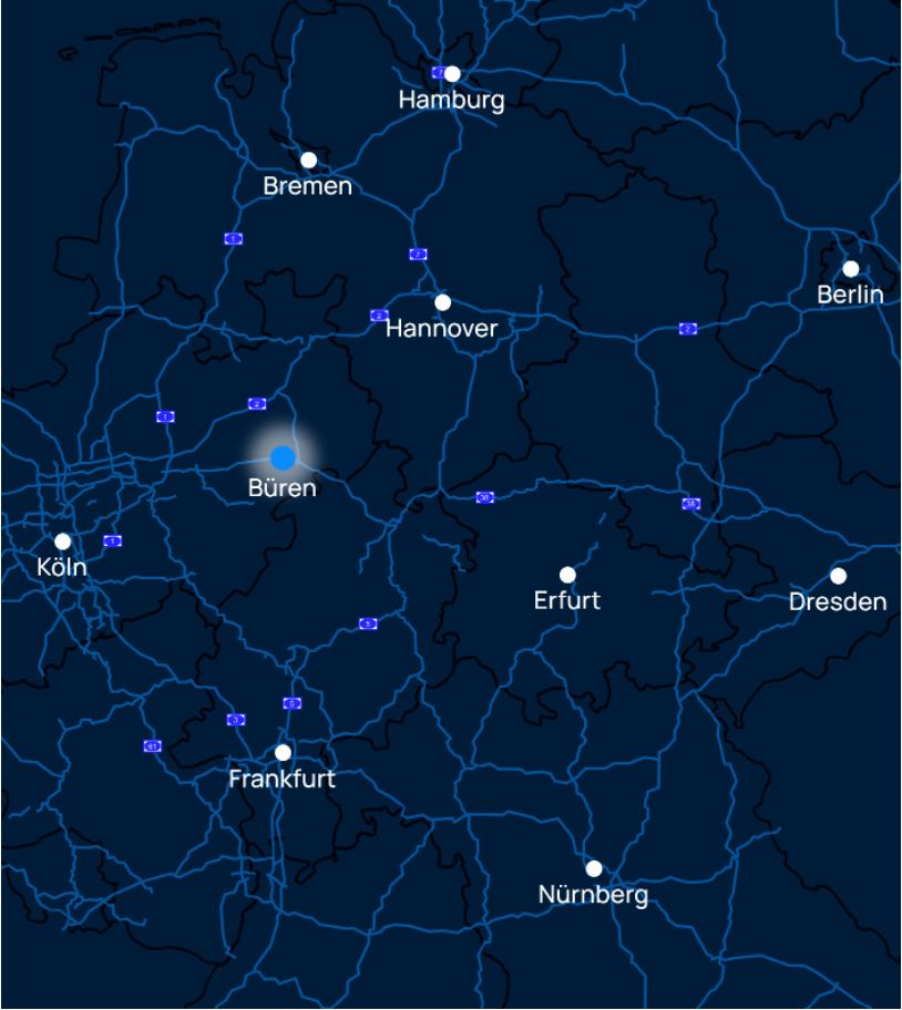 Folgen Sie der A2 Richtung Dortmund. Am Kreuz Bielefeld wechseln Sie auf die A33 Richtung Paderborn und fahren anschließend über die A44 bis zur Ausfahrt Büren.
